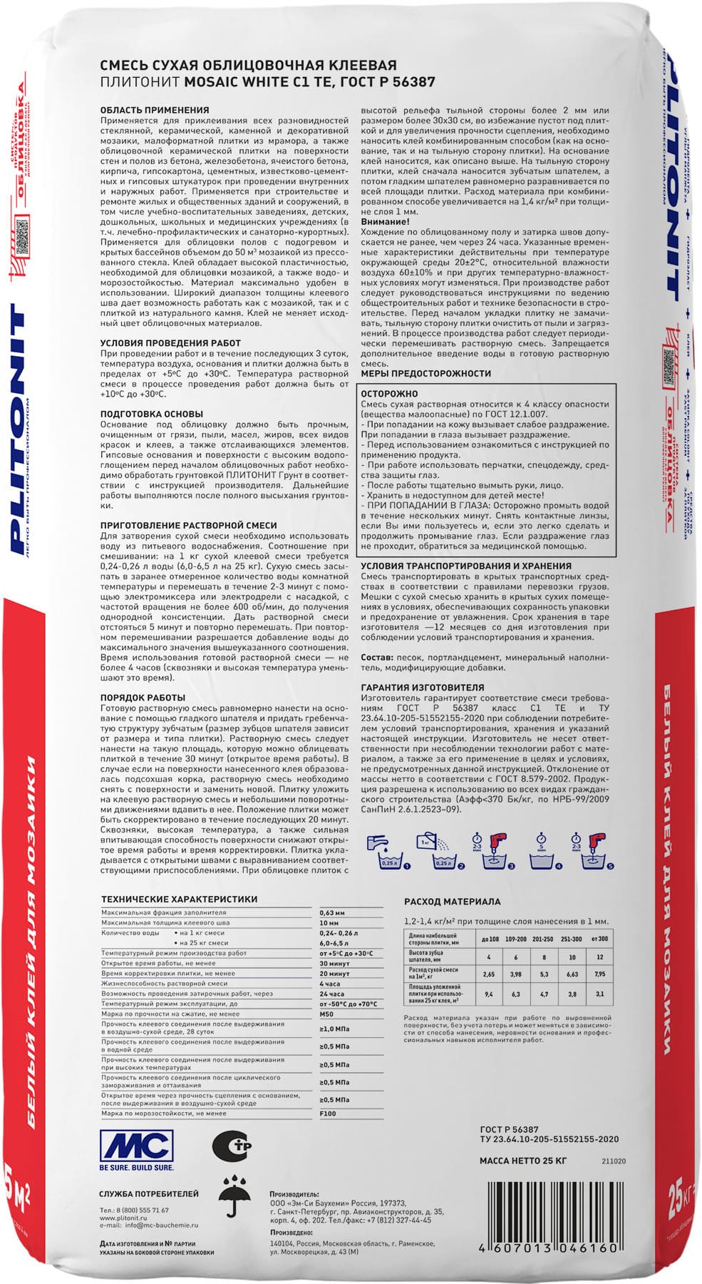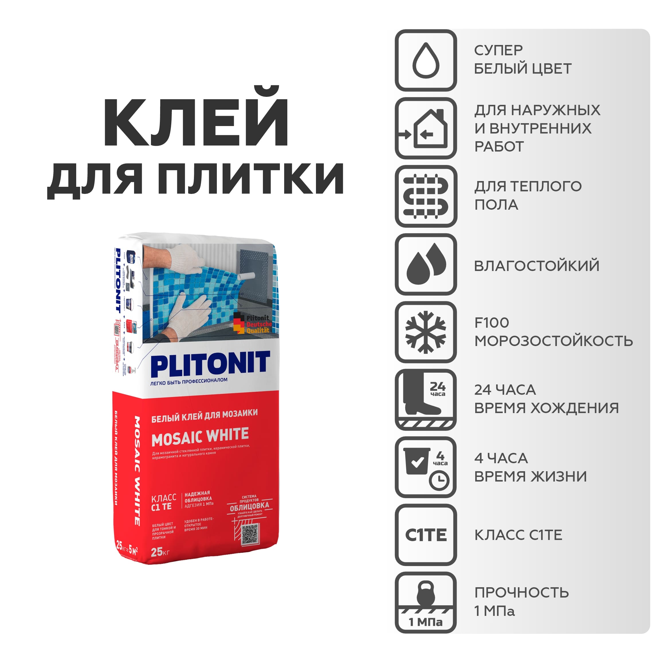 Белый клей для мраморной, мозаичной и стеклянной плитки. Подходит для плитки, натурального и искусственного камня, керамики, керамогранита, клинкера. Класс C1TE. Подходит для облицовки внутри и снаружи помещения.